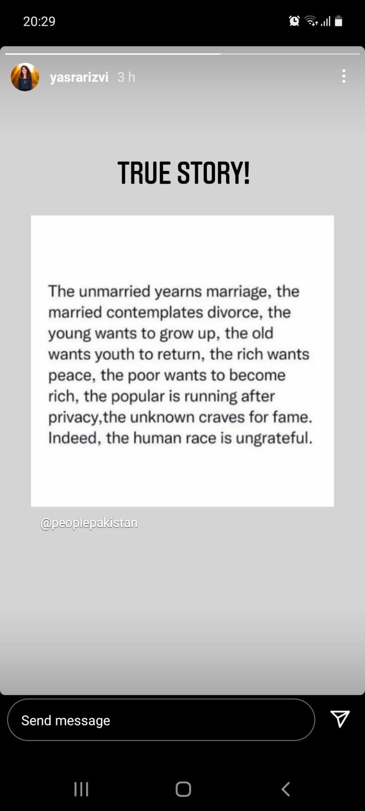 اداکارہ نے لکھا کہ غیر شادی شدہ شادی کی خواہش رکھتا ہے، شادی شدہ طلاق کا سوچتا ہے، نوجوان بڑا ہونا چاہتا ہے، بوڑھا جوان ہونے کا خواہشمند ہے، امیر امن چاہتا ہے، غریب امیر بننا چاہتا ہے، مشہور انسان پرائیویسی کے پیچھے بھاگتا ہے جبکہ گمنام افراد شہرت کو ترستے ہیں۔ بے شک نسل انسانی ناشکری ہے۔