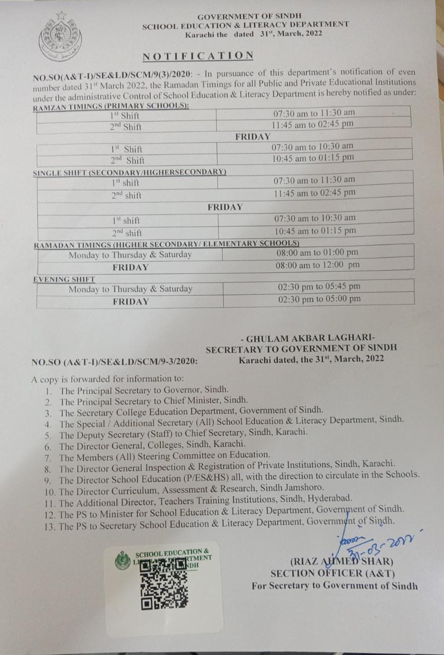 محکمہ تعلیم سندھ نے رمضان المبارک میں اسکولوں کے اوقات کار جاری کردیے