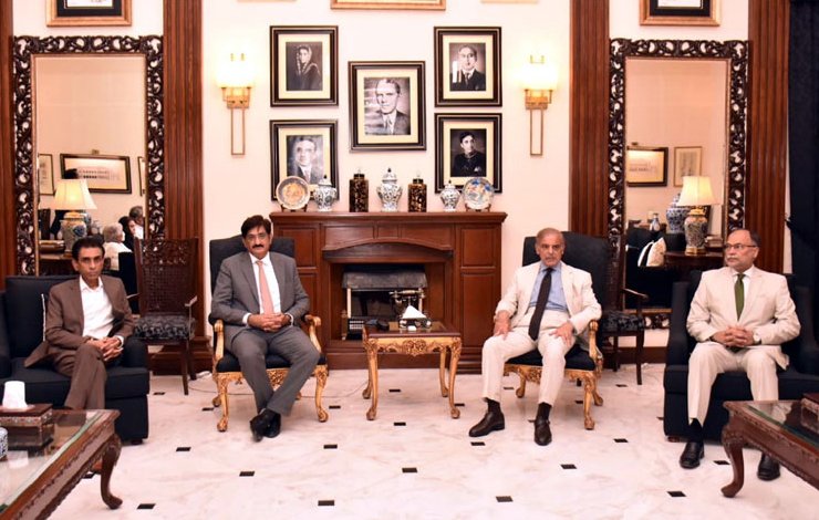 اپنے ایک روزہ دورے کے دوران وزیراعظم شہباز شریف نے سندھ کی حکمران جماعت پاکستان پیپلز پارٹی (پی پی پی) کے وزیراعلیٰ سید مراد علی شاہ اور ان کی کابینہ کے ارکان، متحدہ قومی موومنٹ پاکستان (ایم کیو ایم-پی) جمعیت علمائے اسلام (جے یو آئی ف) کے سرکادہ رہنماؤں سے ملاقات کیں۔
