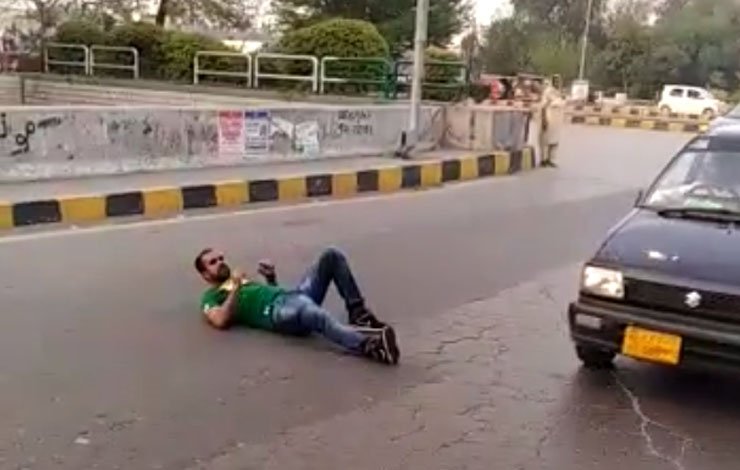 قانون شکن ڈرائیور نے کاغذات طلب کرنے پر پٹرولنگ افسر سے بحث و تکرار اور وڈیو بنانا شرو ع کردی جبکہ اس کا ساتھی سڑک پر لیٹ گیا۔