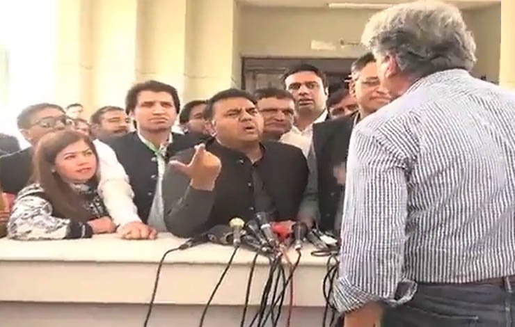 تلخ کلامی کا واقعہ اس وقت پیش آیا جب پاکستان تحریک انصاف کے رہنما اسد عمر اور فواد چوہدری ، ڈپٹی اسپیکر کی رولنگ سے متعلق ازخود نوٹس کیس کی سپریم کورٹ میں سماعت کے موقع پر میڈیا سے گفتگو کررہے تھے۔