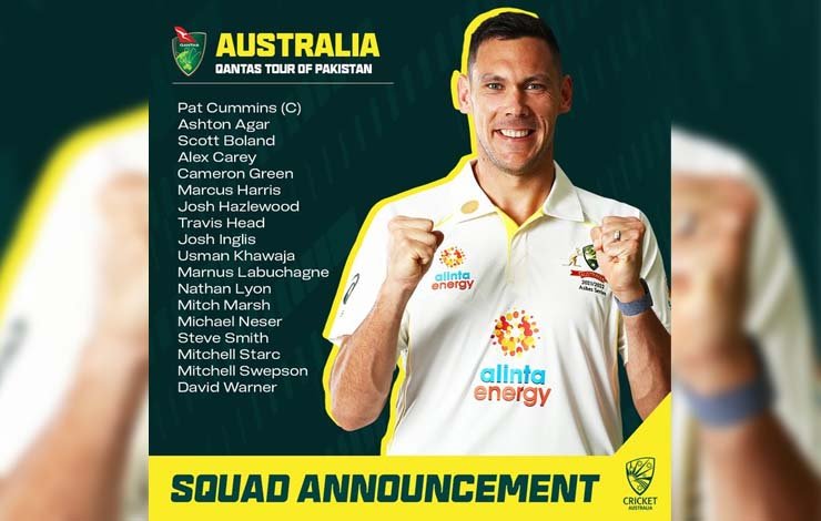 کرکٹ آسٹریلیا نے سیریز کے حوالے سے پی سی بی انتظامات پر اعتماد کا اظہار کرتے ہوئے فل اسٹرینتھ ٹیسٹ ٹیم کا اعلان کیا ہے اور کوئی کھلاڑی سیریز سے دستبردار نہیں ہوا، وہی کھلاڑی پاکستان آ رہے ہیں جنہوں نے حال ہی میں ایشیز سیریز میں حصہ لیا۔