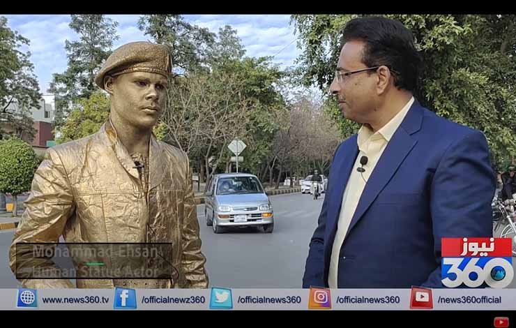 نیوز 360 کے نامہ نگار محمد احسان عرف گولڈن مین سے اسلام آباد کے سیکٹر ایف سیون میں جناح سپر مارکیٹ کے قریب ملاقات کی، جہاں سنہرا روپ اپنائے احسان، اسٹیچو بن کر کھڑے تھے، اور کچھ ہی دیر میں ہمیں معلوم ہوگیا کہ ان کا یہ روپ اسلام آباد کے باشندوں کو بھا گیا ہے۔
