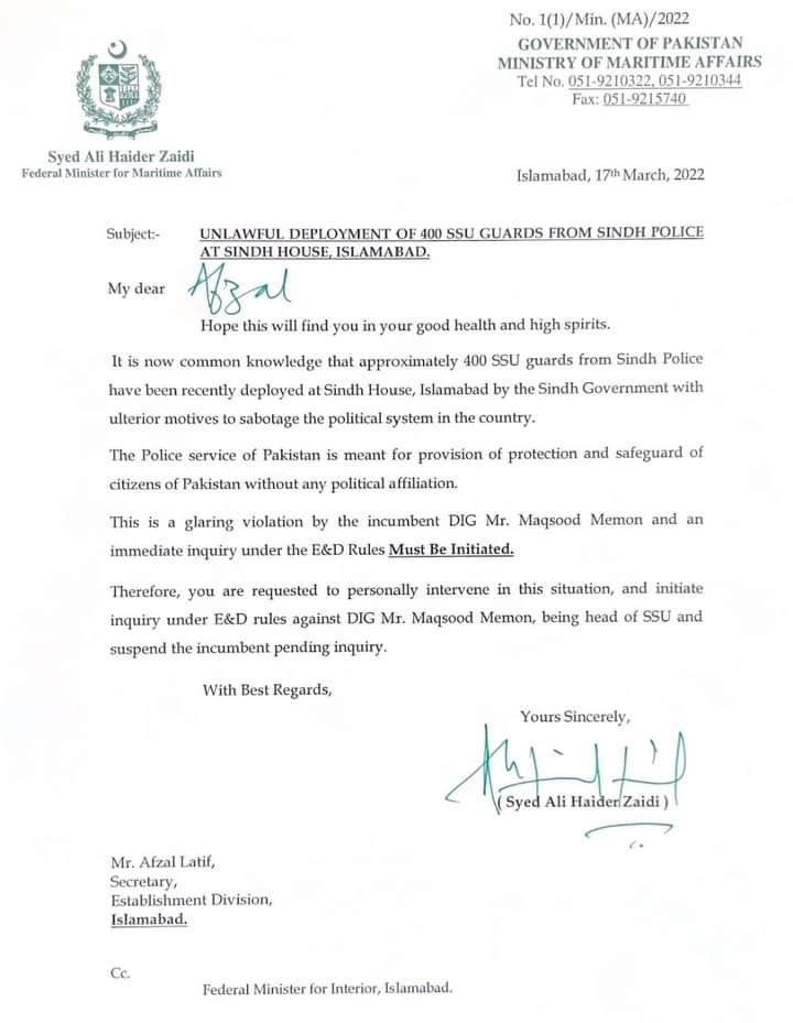 وفاقی وزیر علی زیدی نے سیکریٹری اسٹیبلشمنٹ کو خط لکھ کر مقصود میمن کو معطل کرنے کا مطالبہ کردیا۔علی زیدی نے لکھا کہ  پولیس کا کام عوام کی جان و مال کو تحفظ فراہم کرنا ہے،ڈی آئی جی ایس ایس یو سندھ کے خلاف فوری کاروائی عمل میں لائی جائے۔انکوائری کی حتمی رپورٹ آنے تک ڈی آئی جی مقصود میمن کو معطل رکھا جائے۔