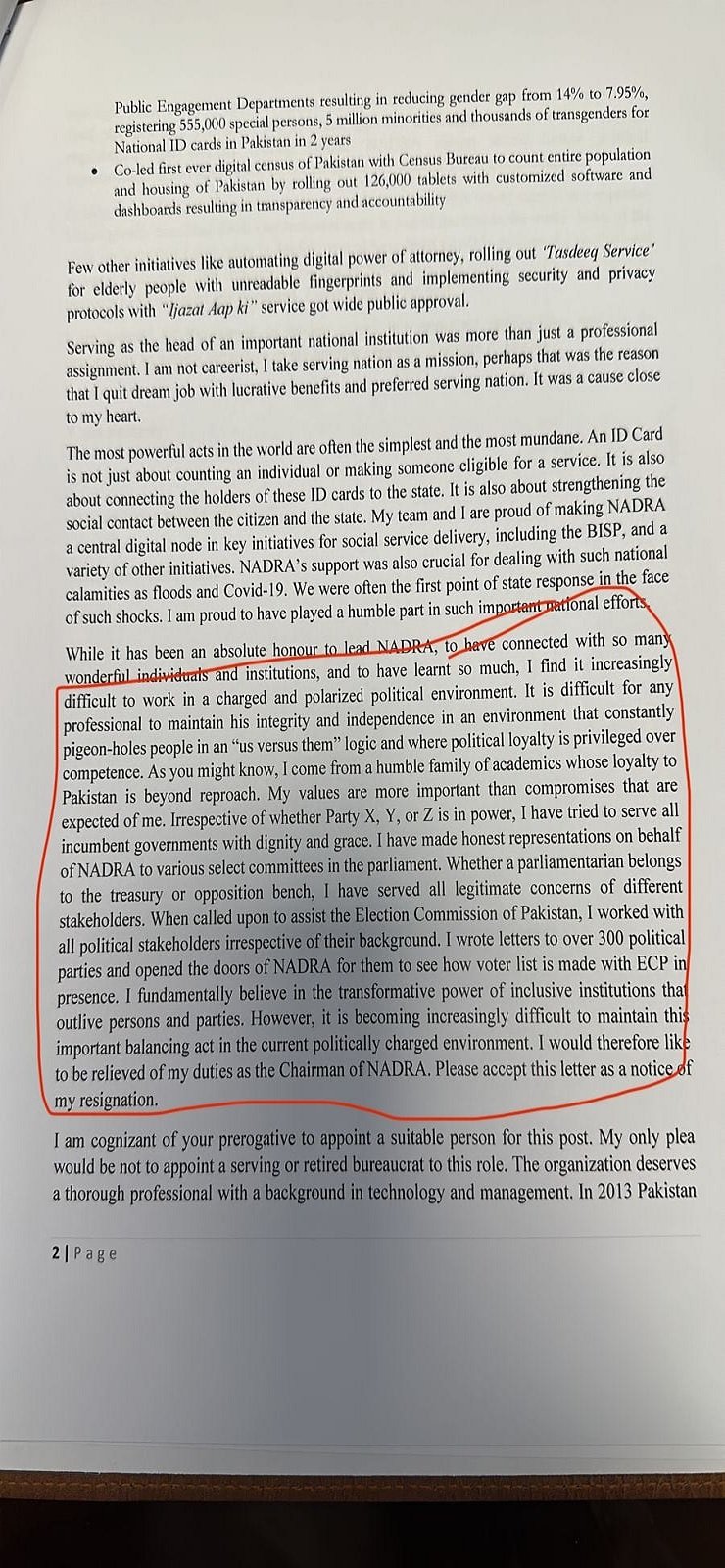 انہوں نے مزید لکھا ہے کہ "تاہم موجودہ سیاسی طور پر سورش زدہ ماحول میں اس اہم توازن کو برقرار رکھنا مشکل ہوتا جا رہا ہے۔  اس لیے میں نادرا کے چیئرمین کی حیثیت سے اپنی ذمہ داریوں سے سبکدوش ہونا چاہوں گا۔ برائے مہربانی اس خط کو میرے استعفیٰ کے نوٹس کے طور پر قبول کریں۔ میں اس عہدے کے لیے کسی موزوں شخص کو مقرر کرنے کے لیے آپ کے اختیار سے واقف ہوں۔ میری درخواست صرف یہ ہوگی کہ کسی حاضر سروس یا ریٹائرڈ بیوروکریٹ کو اس عہدے پر متعین نہ کیا جائے۔”
