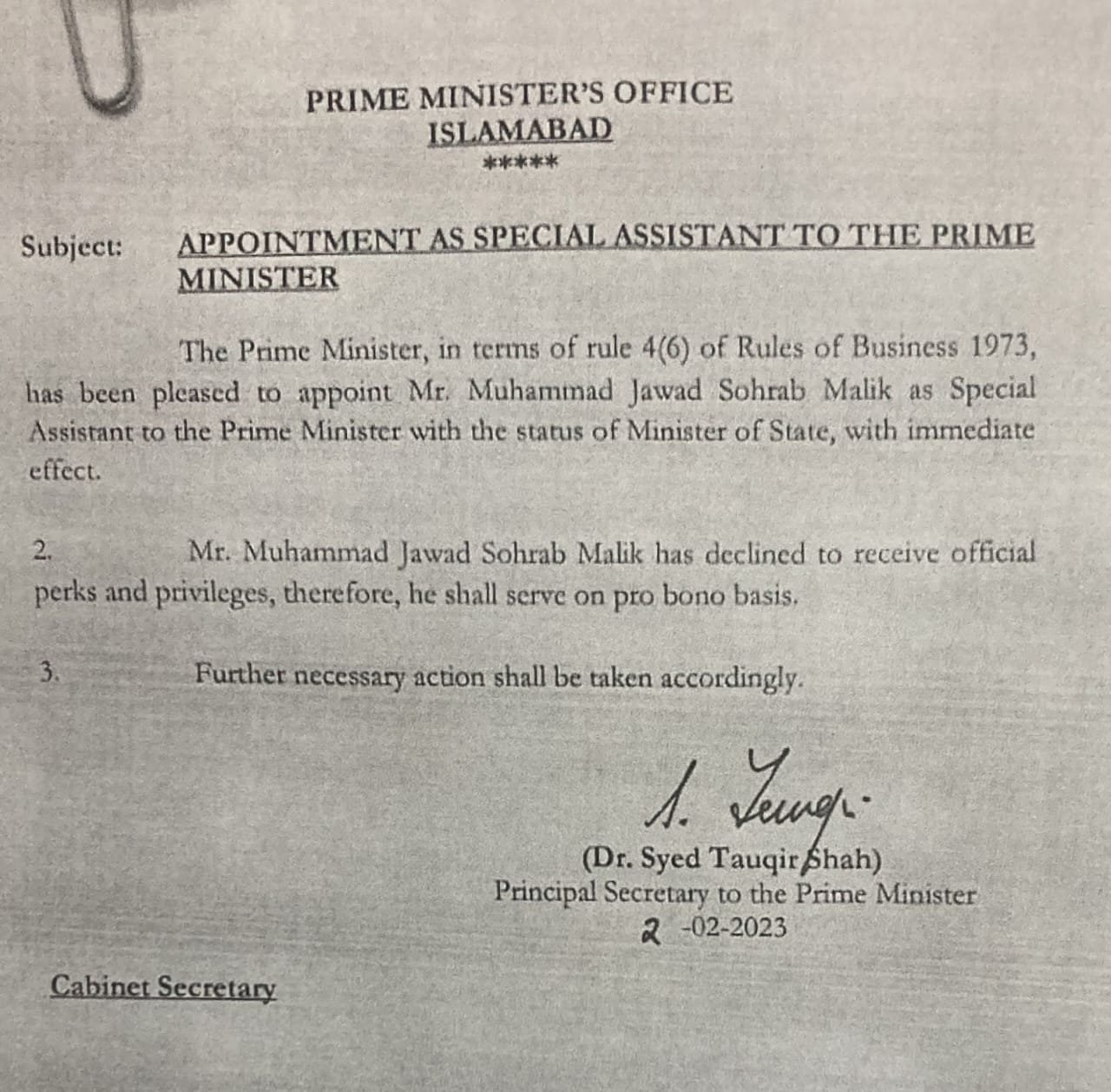 اعلامیے کے مطابق جواد سہراب وزیراعظم شہباز شریف کے خصوصی ٹاسک پر کام کریں گے، انہوں نے بطور معاون خصوصی مراعات لینے سے انکار کر دیا ہےاور وہ رضاکارانہ خدمات انجام دیں گے۔