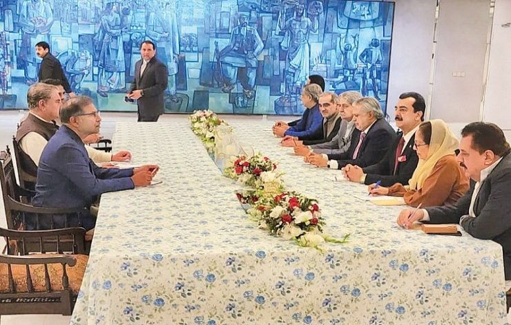 شاہ محمود قریشی کی قیادت میں فواد چوہدری اور سینیٹر علی ظفر کی سربراہی میں تین رکنی وفد حکومتی ٹیم سے مذاکرات کے لیے پارلیمنٹ ہاؤس اسلام آباد پہنچا۔