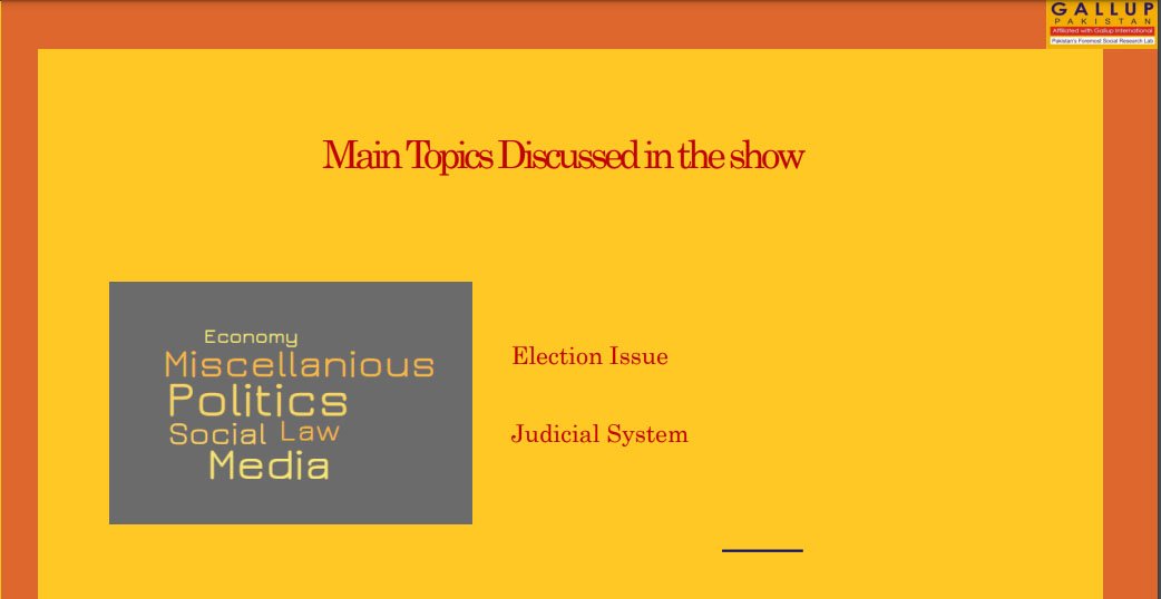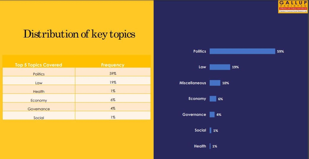 Gallup Pakistan analyzed the content of 10 talk shows across 6 television channels in April 2023; politics was discussed with around 60% frequency, while the economy, governance, and health were each discussed with 6% frequency or less.