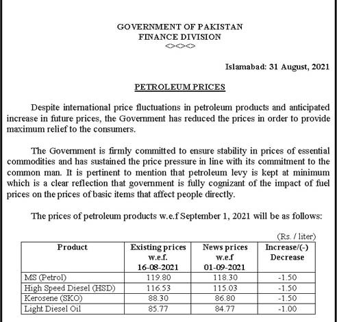 آج  کی  اہم  ترین  خبر یہ  ہے  کہ  حکومت  نے  پیٹرول  اور  ڈیزل  کی  قیمتیں  کم  کردی  ہیں۔ وزارت خزانہ کے نوٹیفکیشن کے مطابق حکومت نے پیٹرول 1 روپے 50 پیسے فی لیٹر سستا کردیا۔  جس  کے  بعد پیٹرول کی نئی قیمت 118 روپے 30 پیسے فی لیٹر ہوگئی ہے۔ ہائی اسپیڈ ڈیزل بھی 1 روپے 50 پیسے فی لیٹر سستا ہوکر115 روپے 3 پیسے فی لیٹر ہوگیا ہے۔ مٹی کے تیل  کی  قیمت  بھی 1روپے 50 پیسے فی لیٹر کم کردی  گئی۔  جس  کے  بعد  اب یہ 86 روپے 80 پیسے فی لیٹر میں فروخت ہوگا۔ لائٹ ڈیزل کی قیمت میں ایک روپے فی لیٹر کمی گئی ہے اور اسکی فی لیٹر قیمت  84 روپے 77 پیسے ہوگئی ہے۔