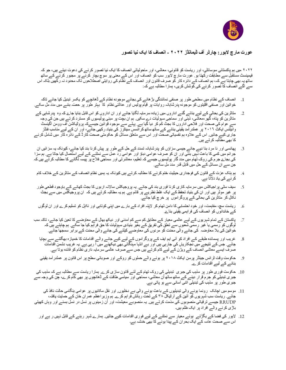 Aurat March Lahore is proud to announce its Manifesto for 2022 centering on the theme of #ReimaginingJustice.Link to Manifesto: https://t.co/dPUNZtOTBJ.
