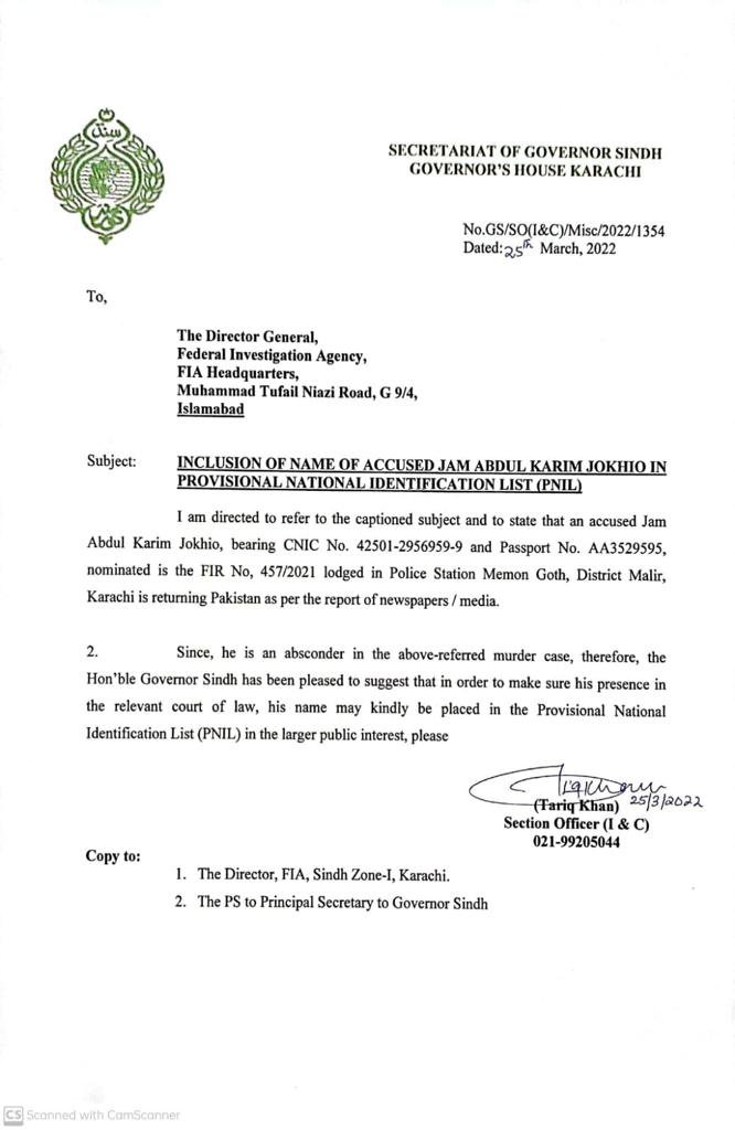 گورنر سندھ عمران اسماعیل نے ڈی جی ایف آئی اے کو لکھے گئے خط میں کہا ہے کہ ملزم عبدالکریم کا نام صوبائی قومی شناختی فہرست (پی این آئی ایل) میں فوری درج کیا جائے۔ ملزم جام عبدالکریم جوکھیو تھانہ میمن گوٹھ، ضلع ملیر میں ایف آئی آر 457/2021 میں نامزد ہے۔