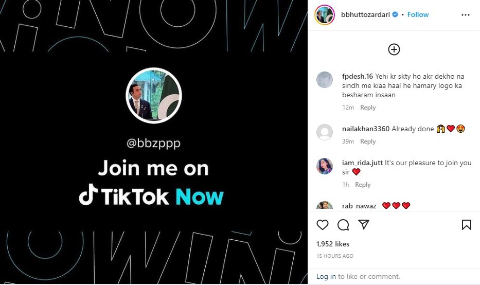 تصاویر اور وڈیو شیئرنگ ایپ انسٹا گرام پر پیپلزپارٹی کے چیئرمین بلاول بھٹوزرداری نے ایک پوسٹ میں تایا کہ انہوں نے ٹک ٹاک جوائن کرلیا ہے۔ انہوں نے عوام سے فالو کرنے کی درخواست بھی کی ۔