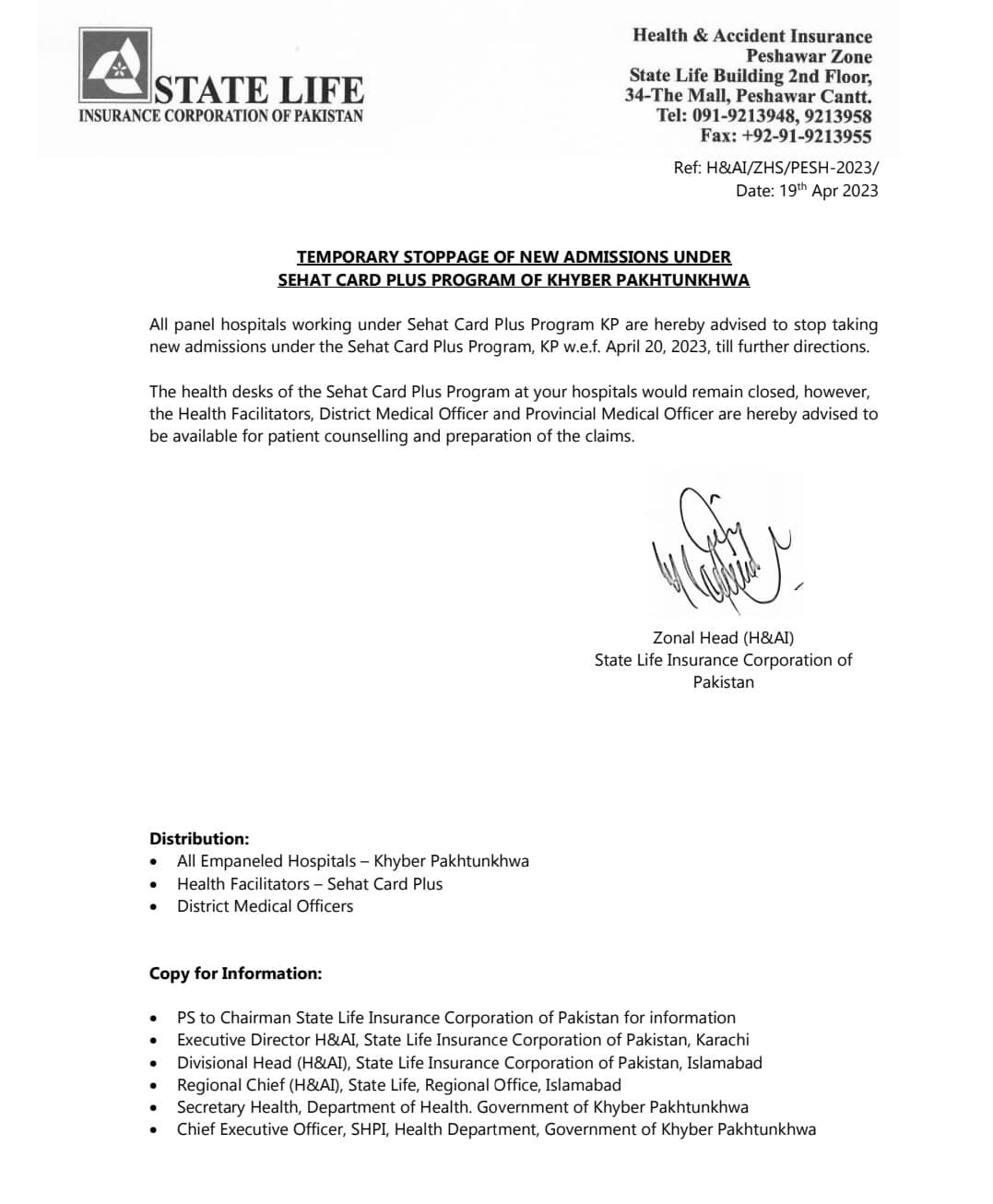 گزشتہ روز اسٹیٹ لائف کارپوریشن آف پاکستان نے خیبرپختونخوا میں صحت کارڈ پلس کے پینل میں شامل تمام اسپتالوں کو صحت کارڈ کے تحت آج سے عارضی طور پر مریضوں کو داخل نہ کرنے کی ہدایت جاری کی تھی۔