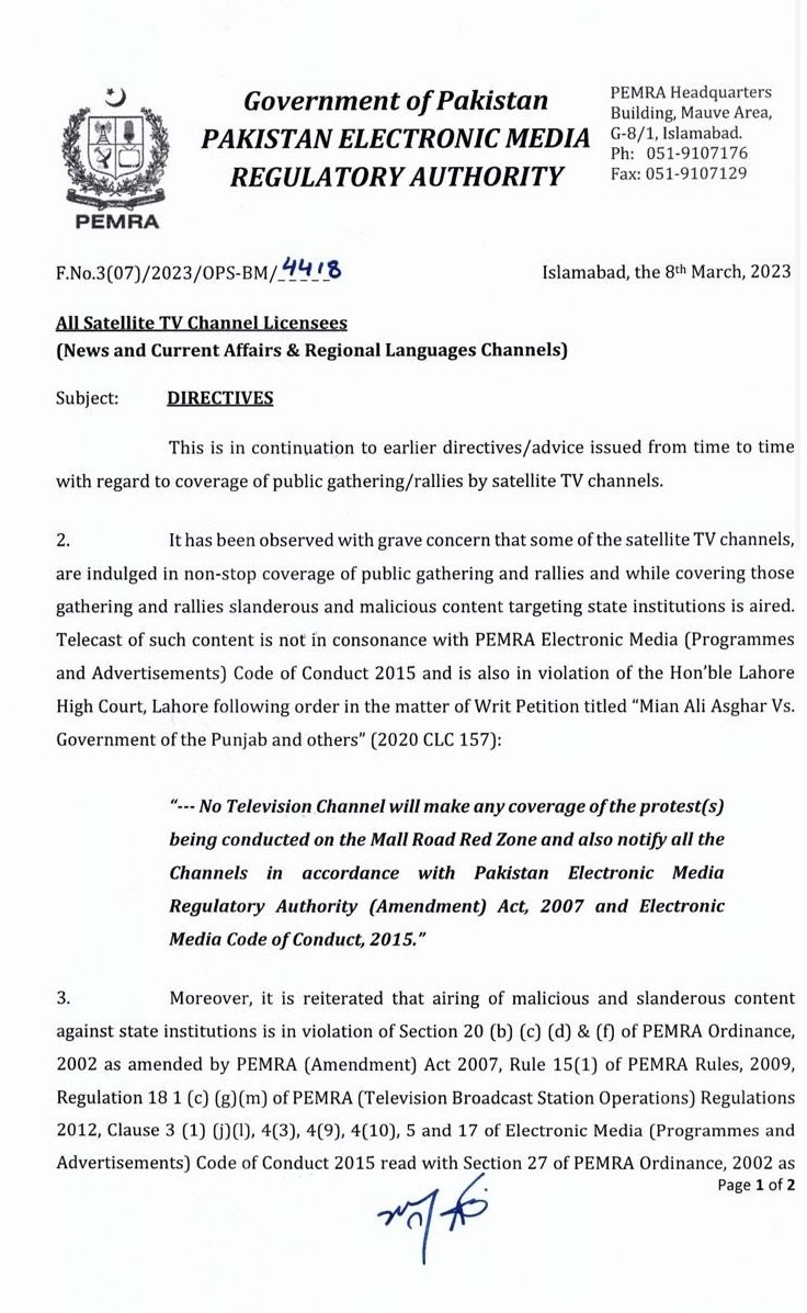 پیمرا نے (ترمیمی) ایکٹ 2007 اور الیکٹرانک میڈیا کوڈ کے تحت تمام سٹیلائٹ ٹی وہ چینلز کو پابند کیا ہے کہ کوئی بھی چینل مال روڈ ریڈ زون پر ہونے والے احتجاج کی کوریج نہیں کرے گا ۔