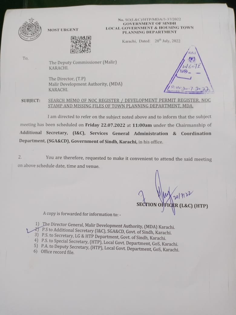 ملیرڈویلپمنٹ اتھارٹی (ایم ڈی اے ) کے ڈاریکٹر ٹاؤن پلاننگ نے سیکرٹری بلدیات اور ڈاریکٹرجنرل ایم ڈی اے کو ریکارڈ کی عدم موجودگی کے بارے میں آگاہ کیا جس پرتحقیقاتی کمیٹی قائم کی گئی جو 3 ماہ بعد بھی کوئی پیش رفت نہیں کرسکی، جولائی میں تشکیل دی گئی کمیٹی کا 3 ماہ کے دوران صرف ایک اجلاس ہوا