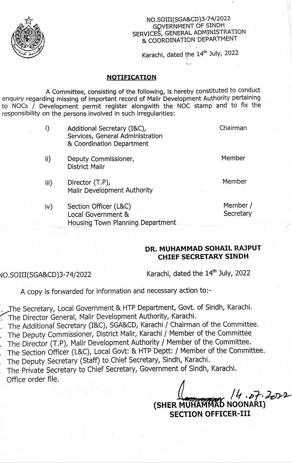 ڈائریکٹر ٹاؤن پلاننگ کی جانب سے ریکارڈ کے غائب ہونے کی اطلاعات کے بعد چیف سیکرٹری سندھ نے تحقیقات کیلئے جولائی میں 4 رکنی کمیٹی تشکیل دی تھی جوکہ ذمہ داروں کو تعین کرنے کی ذمہ دار تھی ۔