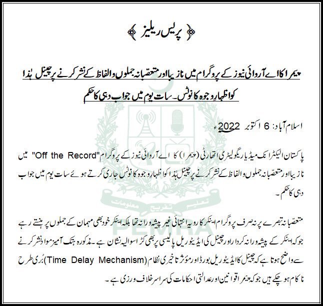 پیمرا نے پروگرام میں  فواد چوہدری کے نازیبا اور متعصبانہ جملے نشر کرنے پر اے آر وائی نیوز کو اظہار وجوہ کا نوٹس جاری کرتے ہوئے 7 روز میں جواب جمع کرانے کاحکم جاری کردیا۔