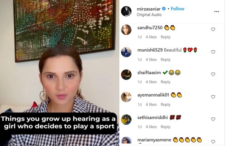 - چند سیکنڈز کی انسٹاگرام ویڈیو میں ثانیہ نے بتایا کہ جب کوئی لڑکی بالغ ہونے پر اسپورٹس کی طرف جانے کا فیصلہ کرتی ہے تو اسے سب سے پہلے یہ کہا جاتا ہے کہ دھوپ میں کھیلنا لڑکوں کا کام ہے لہٰذا اسے کھانا بنانا سیکھنا چاہیے۔