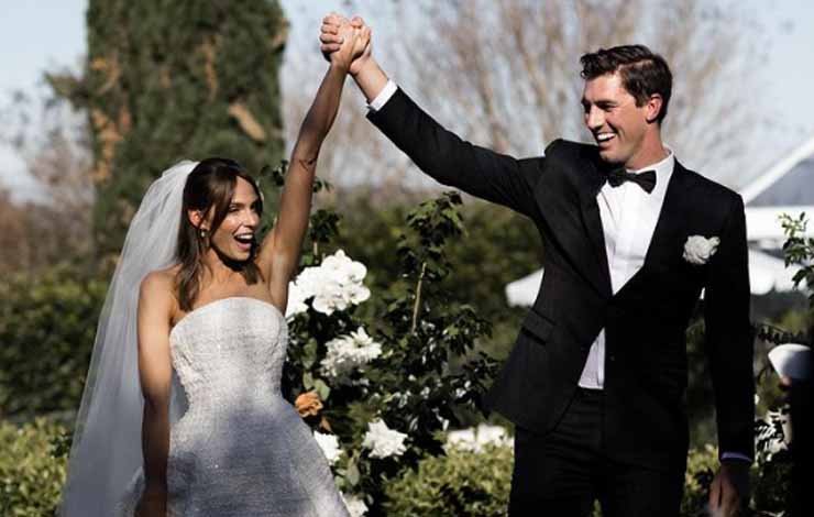 پیٹ کمنز نے ٹوئٹر پر اپنی شادی کی تصویر شیئر کی جس میں آسٹریلوی کپتان کو سیاہ رنگ کا سوٹ پہنے دیکھا جاسکتا ہے جب کہ ان کی دلہن بیکی نے روایتی طرز کا سفید عروسی جوڑا پہنا ہوا ہے۔
