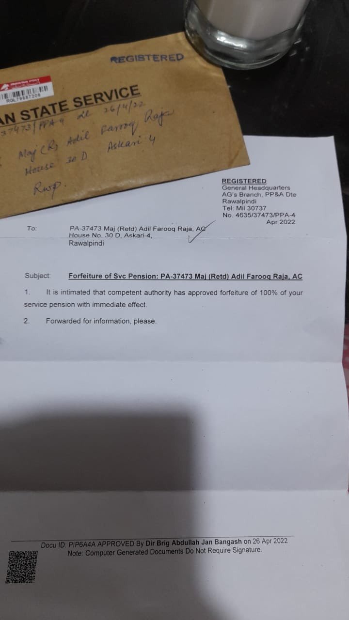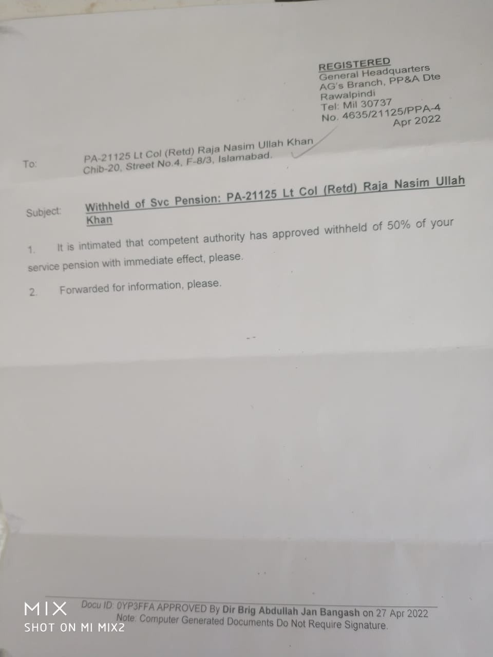 لیفٹیننٹ میجر (ر) راجا نسیم اللہ کو جاری کردہ لیٹر میں کہا گیا ہے کہ آپ کو مطلعہ کیا جاتا ہے متعلقہ حکام نے آپ کی50 فیصد پنشن فوری طور پر روکنے کی منظوری دے دی ہے۔