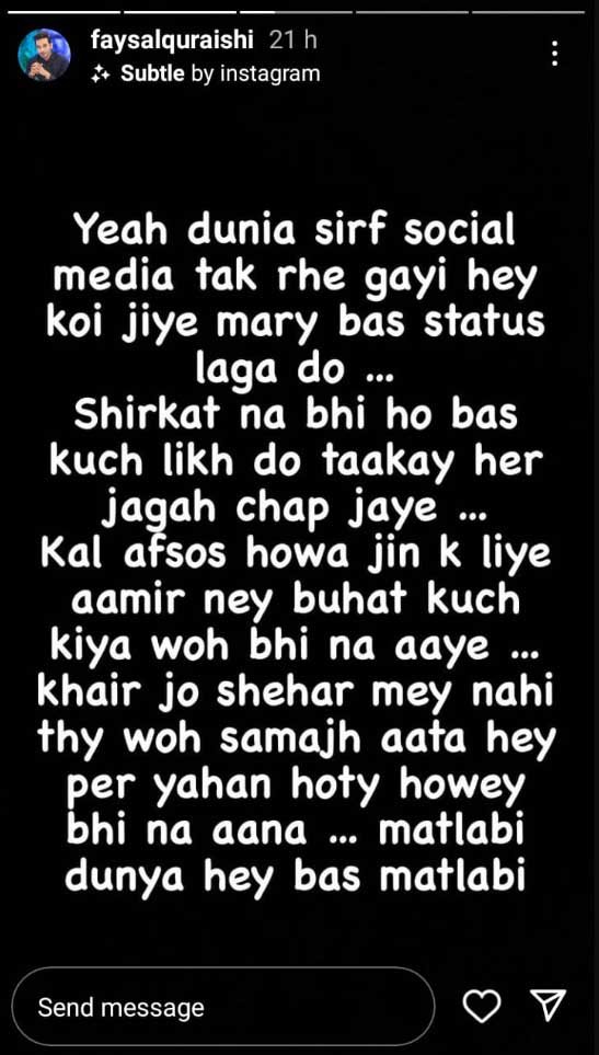 دریں اثنا اداکار فیصل قریشی نے عامر لیاقت حسین کے جنازے میں شرکت نہ کرنے والے فنکاروں پر غصے اور دکھ کا اظہار کیا ہے۔فیصل قریشی نے انسٹاگرام پر اسٹوری شیئر کی اور لکھا کہ یہ دُنیا صرف سوشل میڈیا کی حد تک رہ گئی ہے، کوئی مرے یا زندہ رہے، بس اسٹیٹس لگا دو۔